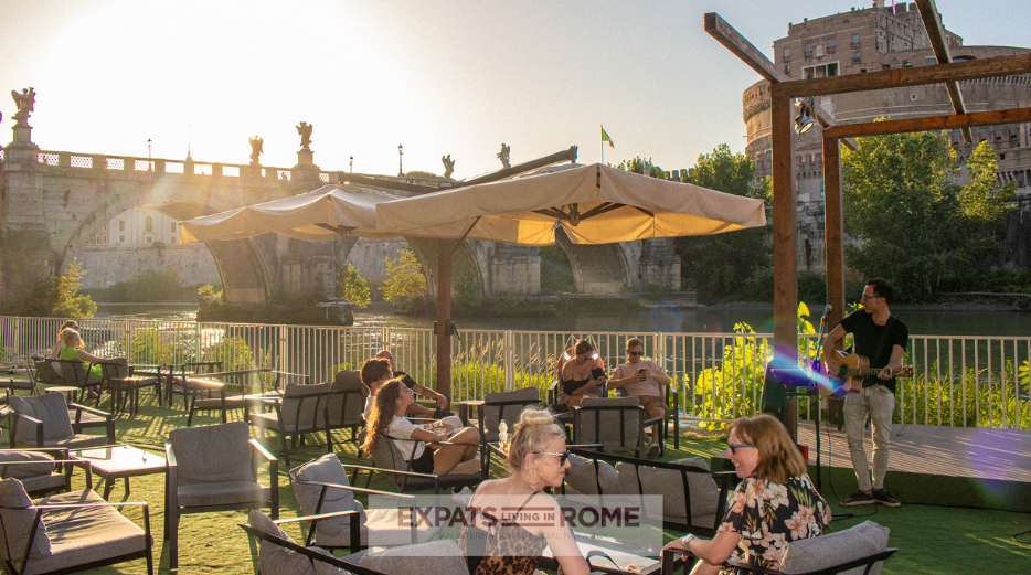 Terrazza Tevere, along the Lungotevere nightlife strip, directly across from Castel Sant’Angelo. Access the venue by walking down the side steps leading to the bridge.