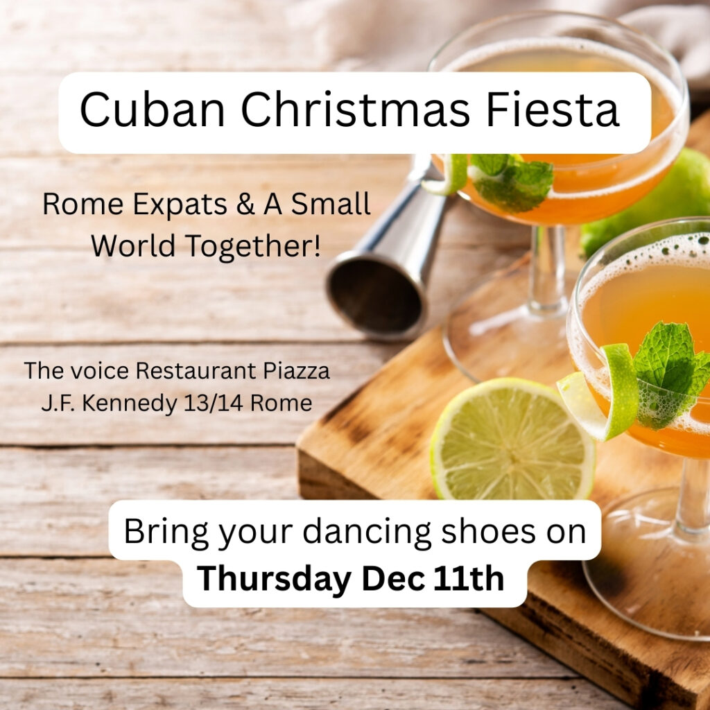 Get ready for a vibrant Holiday celebration with a Cuban Twist! Join Expats living in Rome & A small World for an unforgettable evening filled with rhythm, energy, and festive spirit in the heart of Rome, all while enjoying drinks and apéro-style food.